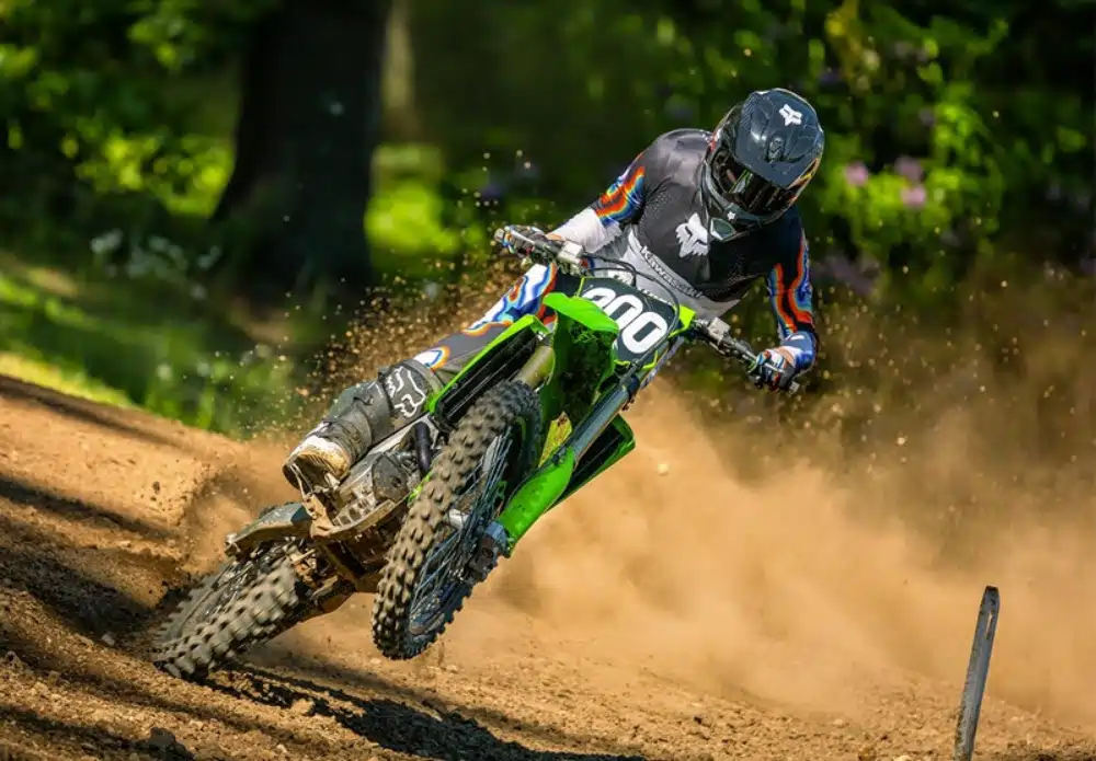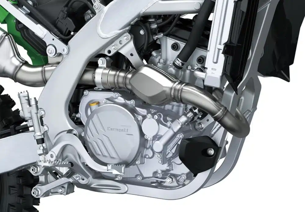The redesigned frame based on the 2024 KX450 accommodates updates to the engine’s intake and exhaust systems, while delivering a high level of light, agile handling and a composed character. An optimized stiffness balance contributes to improved front-end feel, which translates to improved cornering performance in a variety of conditions.