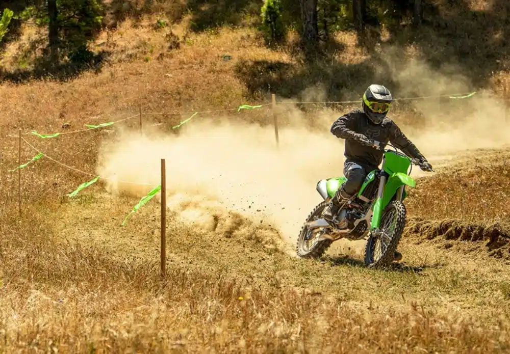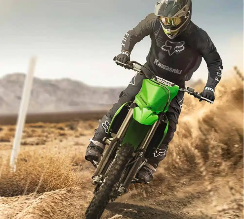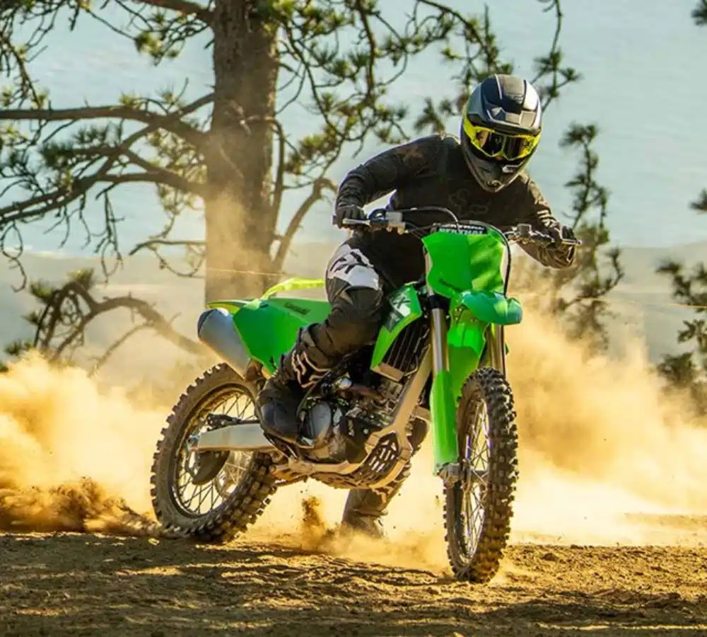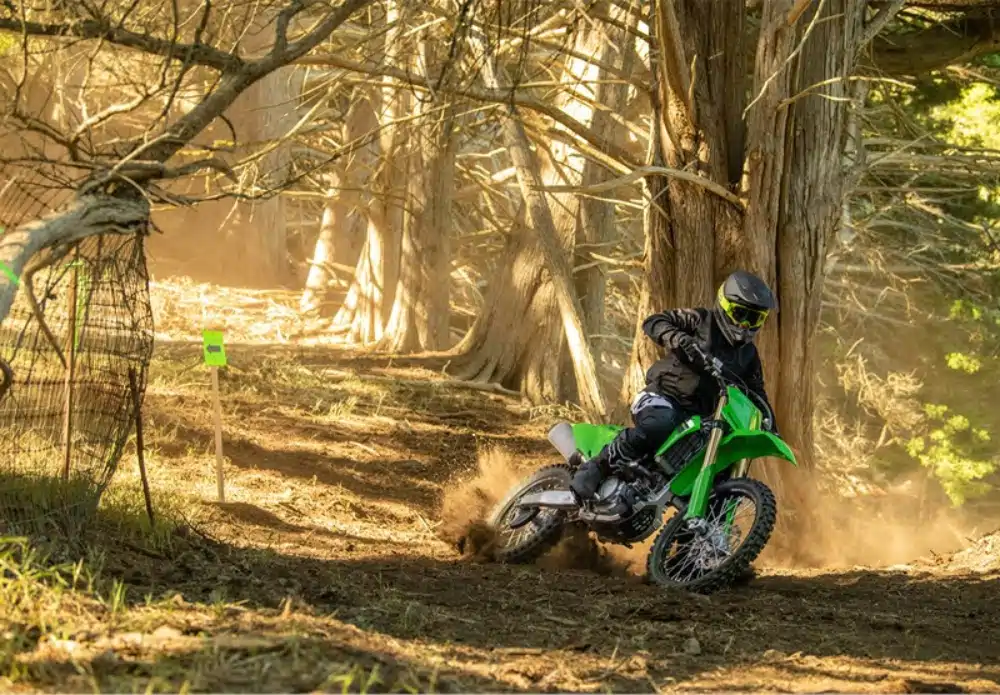 Equipped with a powerful engine, the KX250’s slim chassis offers light and nimble handling. High-quality suspension and brake components, along with sleek, adjustable ergonomics, all contribute to its off-road riding performance.