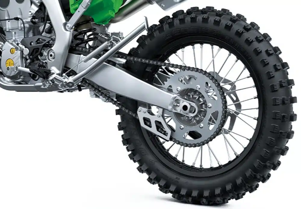 While the KX250 features F21”/R19” aluminum rims, the KX250X uses an F21”/R18” combination that facilitates power to the ground. Dunlop AT81 enduro tires complement the KX250X’s dedicated rims and are well-suited to the conditions encountered in cross-country riding.