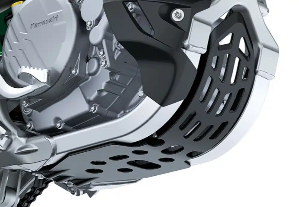 Skid plate bergaya pabrik KX dan side stand yang nyaman keduanya merupakan perlengkapan standar. Skid plate yang kokoh membantu melindungi bagian bawah engine, dan memfasilitasi menaklukan rintangan yang ditemui di jalan, sementara side stand berguna saat berhenti dari area paddock.
