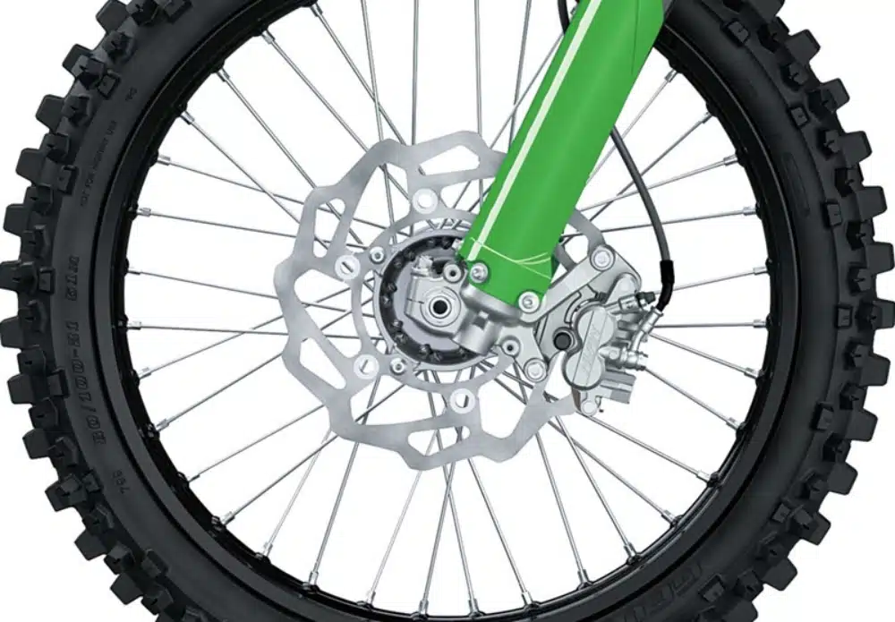The KX250’s cross-country-optimized brake package includes a large-diameter ø270 mm front disc complemented by a ø240 mm rear disc, a KX450-type front master cylinder, and KX250X-specific pads, delivering powerful stopping power and high braking performance.