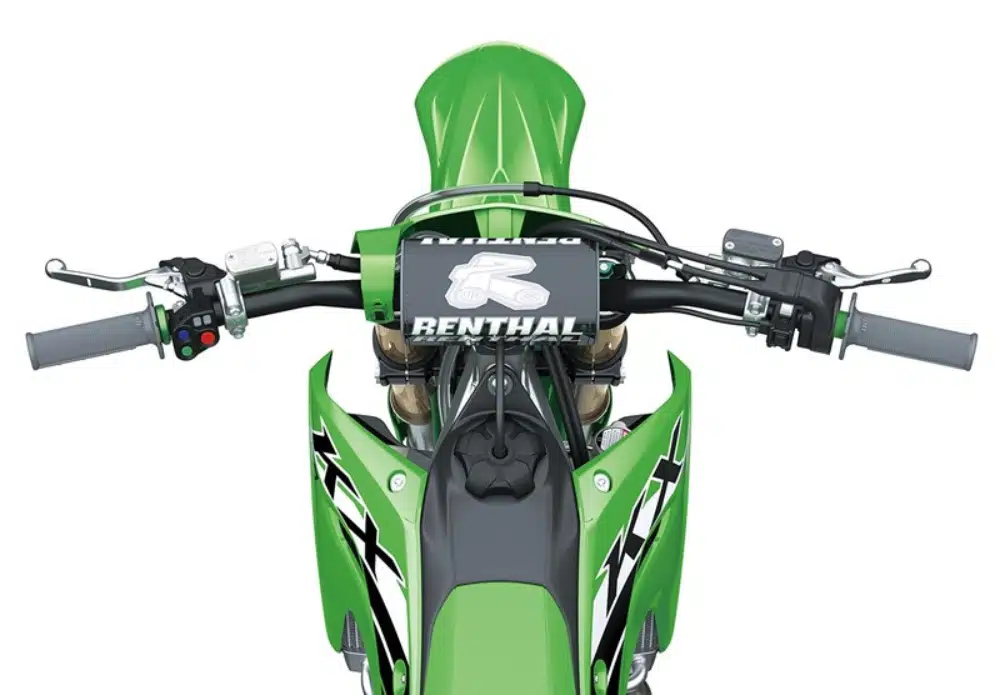 A choice of four handlebar positions and two footpeg positions allows the rider to customize the riding position to suit their body size and preferences. A factory-style ø28.6 mm (1-1/8”) Renthal aluminum fat bar helps reduce vibration and shock transmitted to the rider, while a lower, closer grip position helps position the rider in a position that makes it easier to put weight on the front wheel.