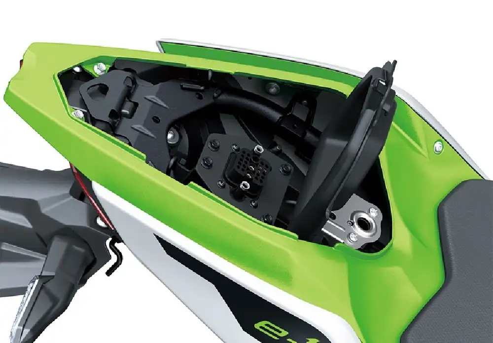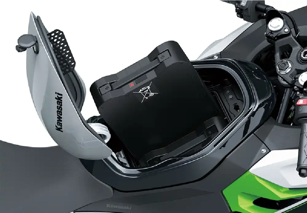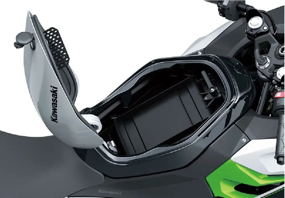 Instead of a fuel tank, the Ninja e-1 is equipped with a convenient storage box. Lifting the lid reveals 5 liters of easily accessible space for small items like gloves or rain gear.