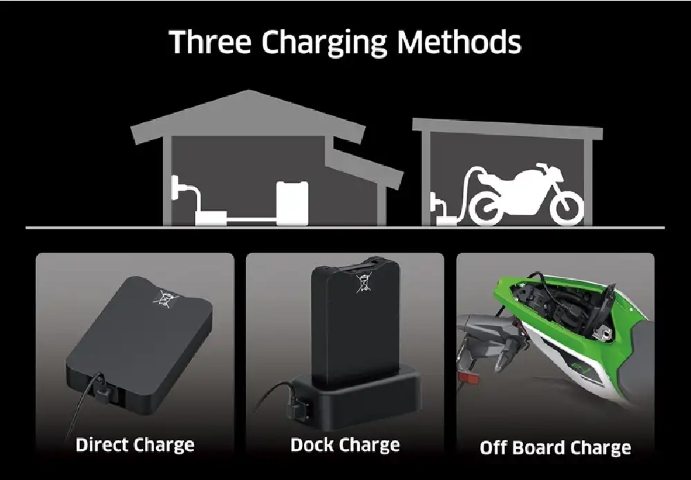 When charging outside the vehicle with the battery installed, an accessory adapter is required (to connect the charger and the motorcycle). The batteries are charged simultaneously, eliminating the need to manually switch from one battery to the next. Fully charging both batteries takes a maximum of 7.4 hours (3.7 hours x2).