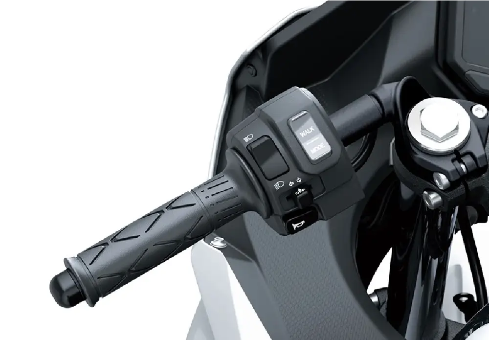 Kawasaki’s first electric road vehicle is powered by a compact brushless electric motor that offers strong off-the-line acceleration and low-end response. Rider-selectable power levels contribute to rider confidence, while unique EV features like e-boost and WALK Mode add to the exhilarating experience. The rider-friendly electric motor is also clean and quiet.