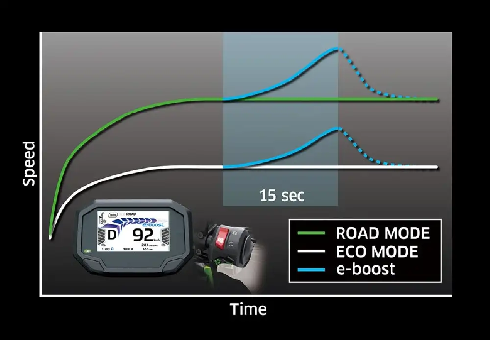 With e-boost, riders can access increased power for approximately 15 seconds. When activated, acceleration is stronger and the top speed is increased: 64 km/h >> 75 km/h (ECO), 88 km/h >> 105 km/h (ROAD).