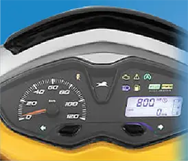 Advanced semi-digital speedometer with mileage indicator, digital clock, service reminder, and low battery indicator.